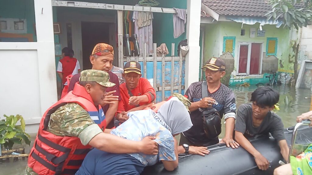 Babinsa bersama unsur Pemerintah desa buni Bakti melaksanakan evakuasi warga sakit dan lanjut usia (lansia) akibat banjir yang merendam Perumahan Taman Plamboyan, RT 25 RW 14, Desa Buni Bakti, Kabupaten Bekasi.