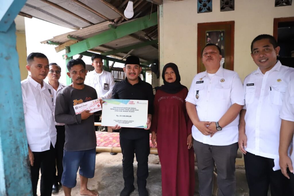 Kepala Dinas Perkimtan Kabupaten Bekasi mendampingi Bupati Bekasi Ade Kuswara Kunang, menyerahkan secara simbolis rumah tidak layak huni di Desa Jayamulya, Kecamatan Serang Baru.